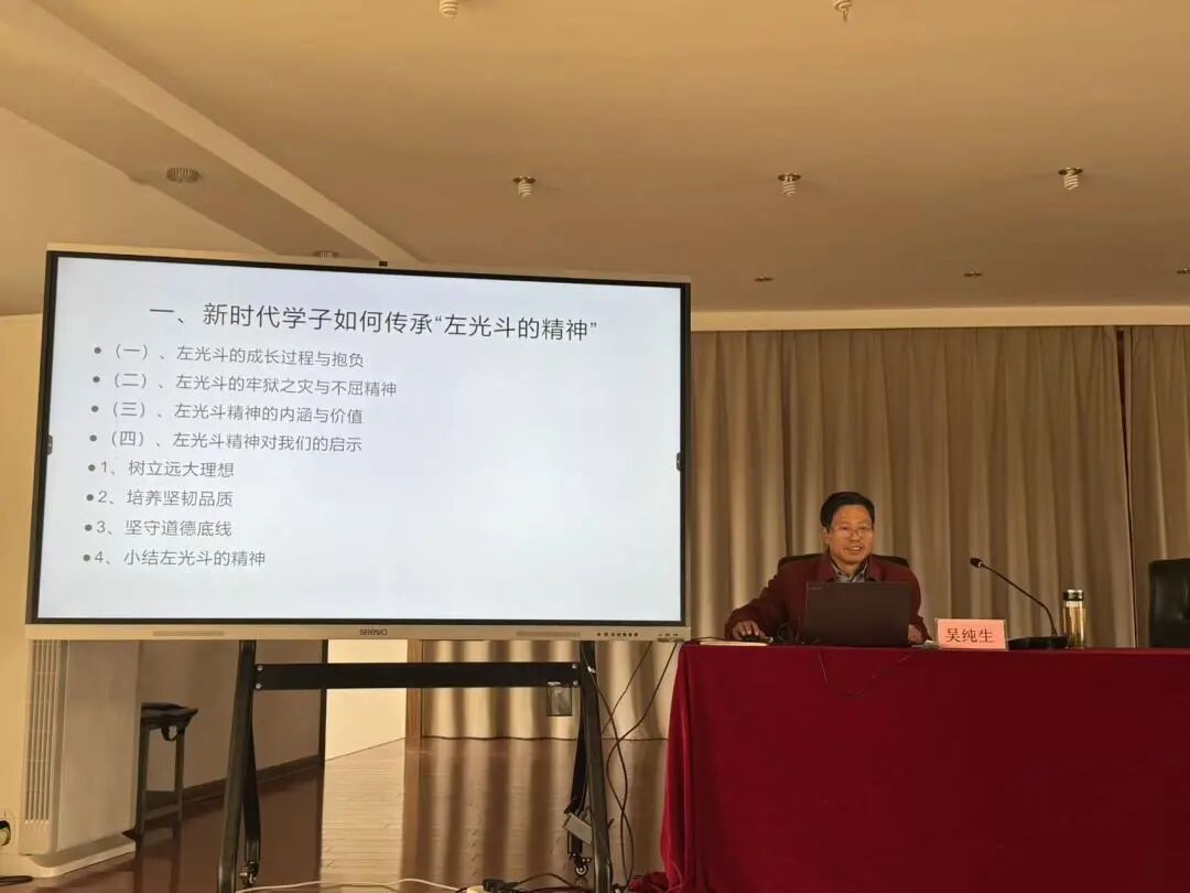 在热烈的氛围中,《左光斗传》的作者——我校81届知名校友吴纯生以“承先贤浩然正气,做时代有为青年”为主题,展开了精彩的演讲。吴先生深耕文学创作多年,以笔墨勾勒历史人物左光斗的铁骨丹心,他结合自身的学习和写作经历,对左光斗的成长过程与抱负、牢狱之灾与不屈精神进行了深入解读。在讲解过程中,吴纯生校友尤其强调了左光斗身上所具备的爱国精神、正义担当精神,对其不屈的人格进行了高度赞扬。他鼓励同学们要树立远大理想,培养坚韧品质,坚守道德底线。