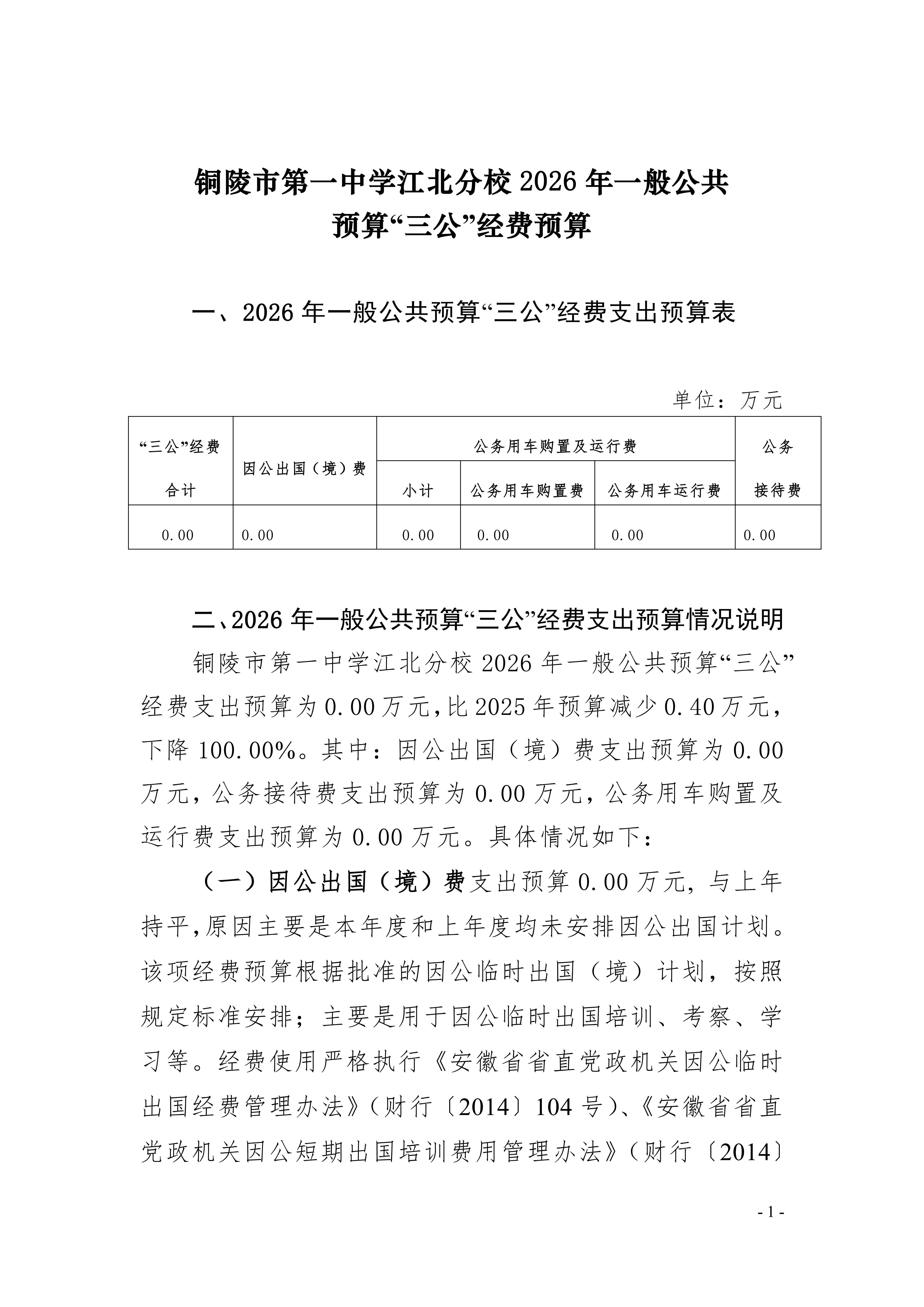 2026年铜陵市第一中学江北分校单位“三公”经费预算公开