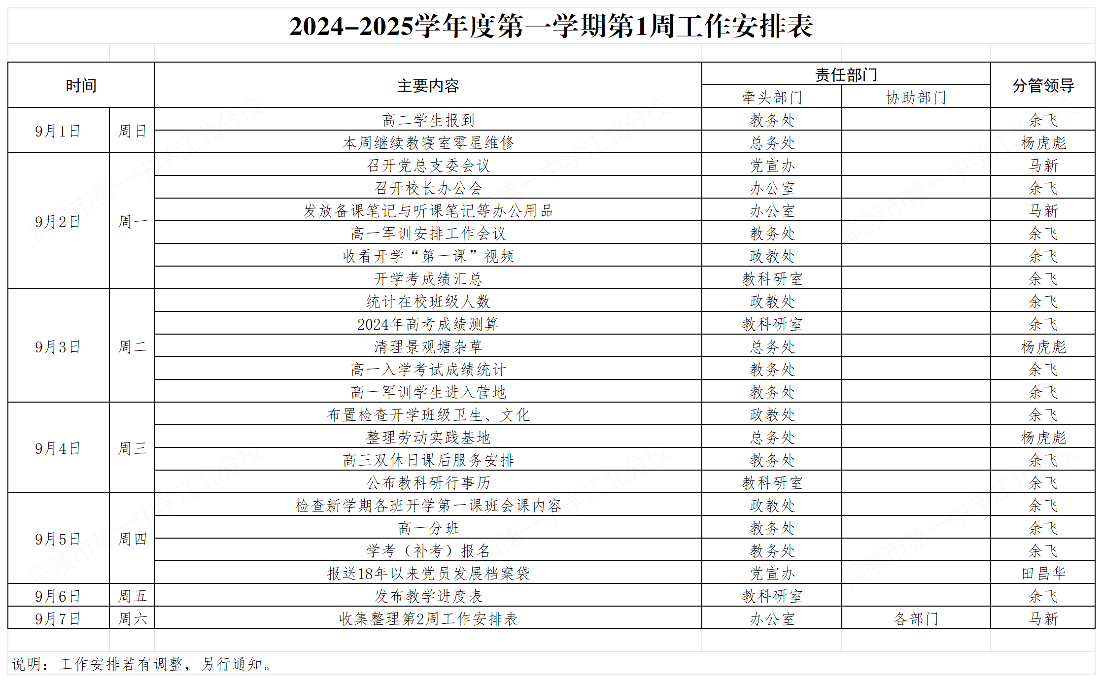 2024-2025学年度第一学期第1周工作安排
