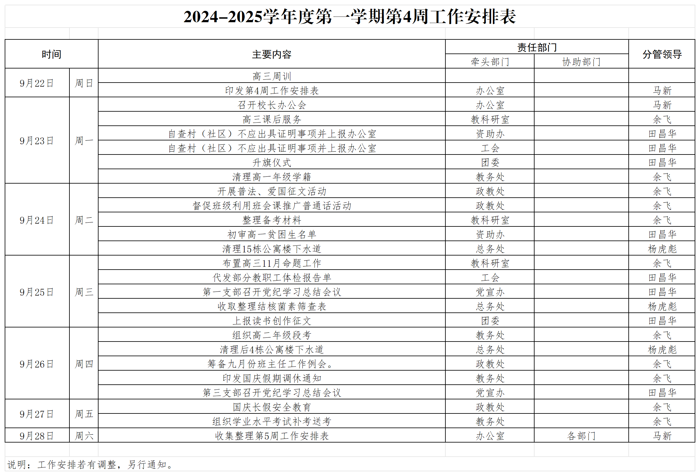 2024-2025学年度第一学期第4周工作安排