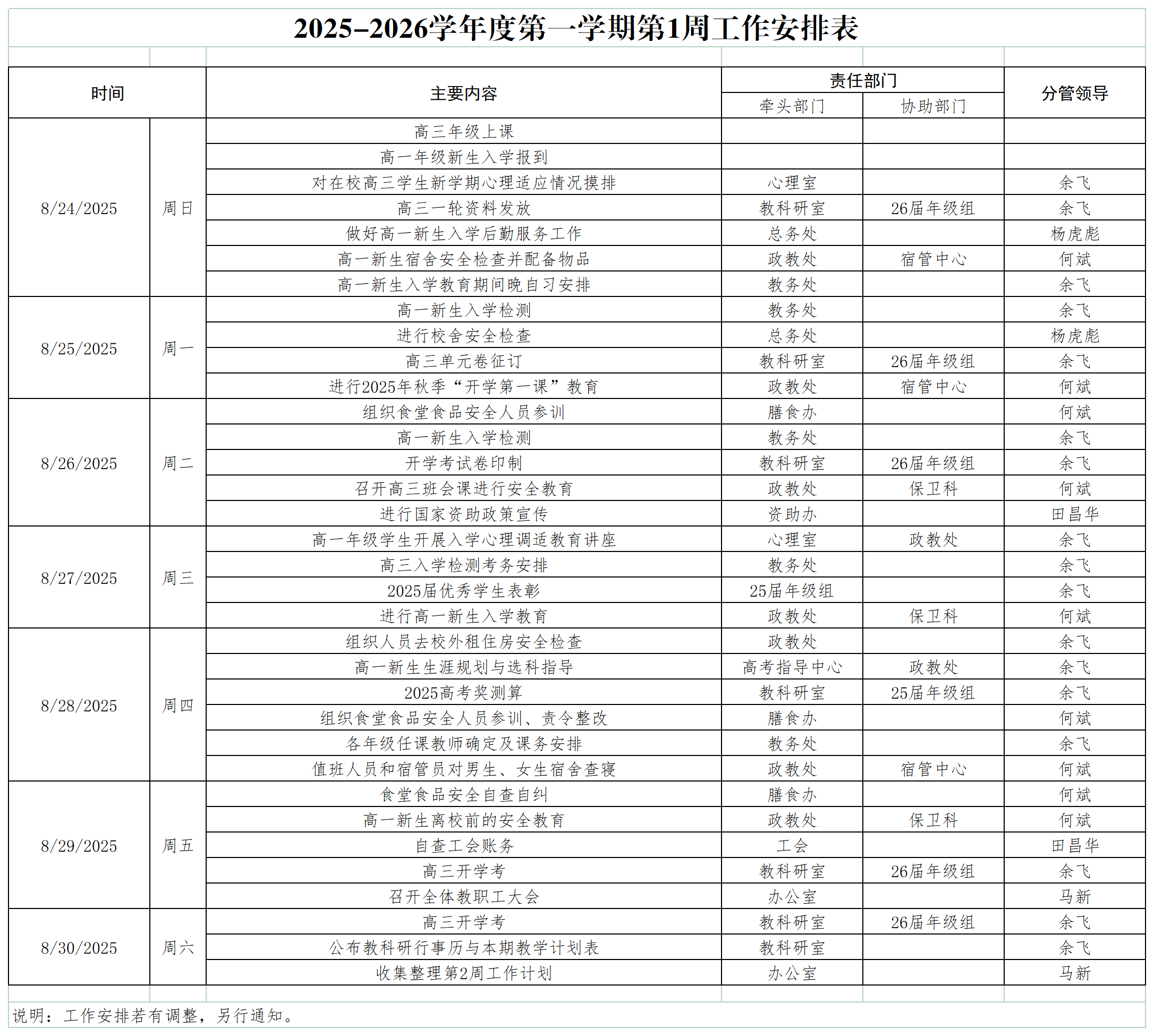 2025-2026学年度第一学期第1周工作安排
