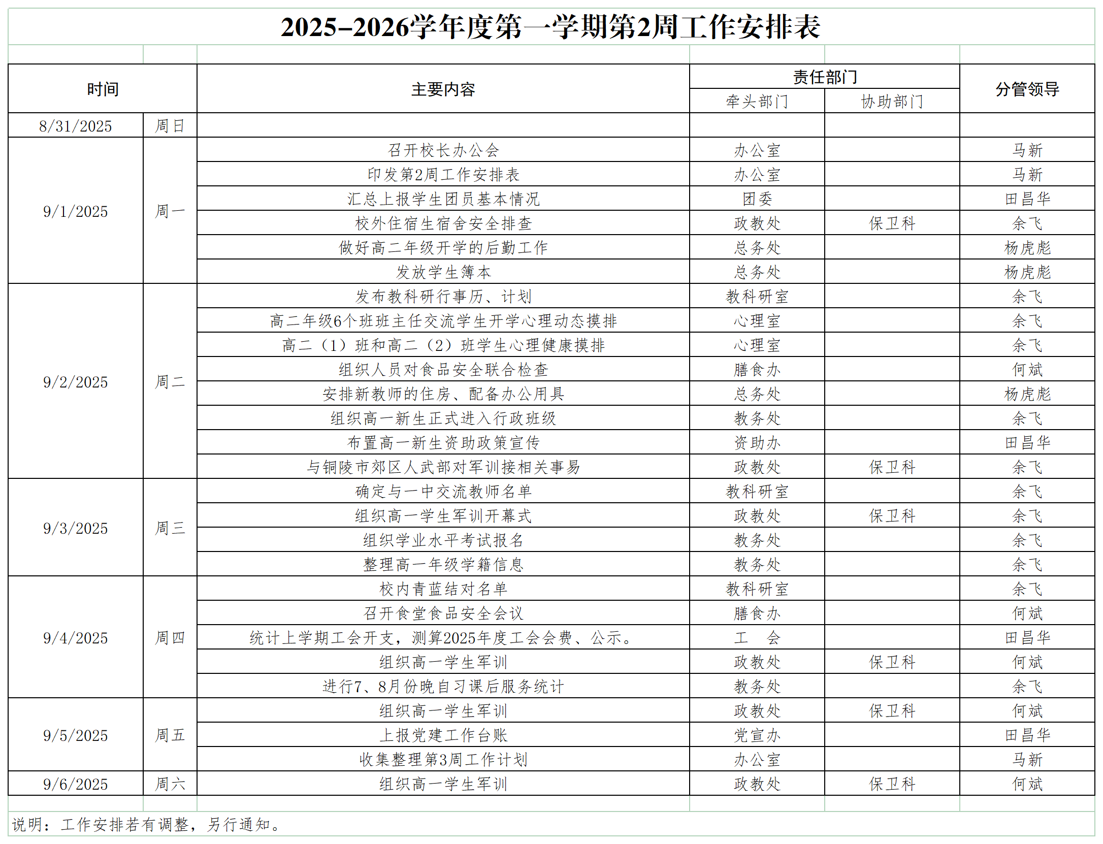2025-2026学年度第一学期第2周工作安排