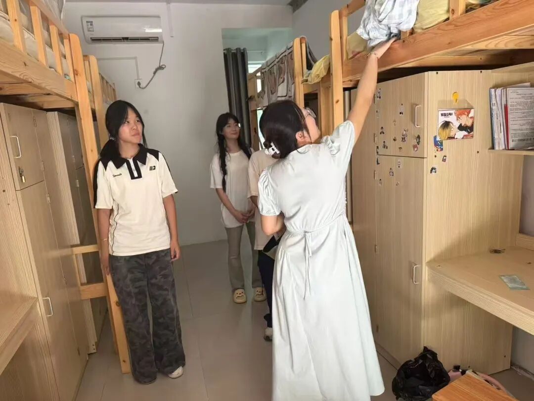 "被子要这样翻折才能出棱角"、"洗漱用品应该按照使用频率摆放"、"鞋子要成线放置"……志愿者们不仅耐心讲解,更亲自示范。内务整理是培养学生自理能力的起点,更是他们学会集体生活的第一步,帮助他们更快地找到归属感。