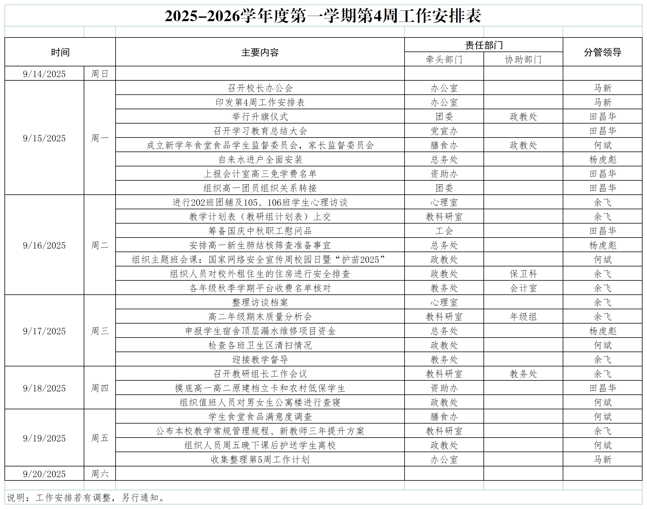2025-2026学年度第一学期第4周工作安排