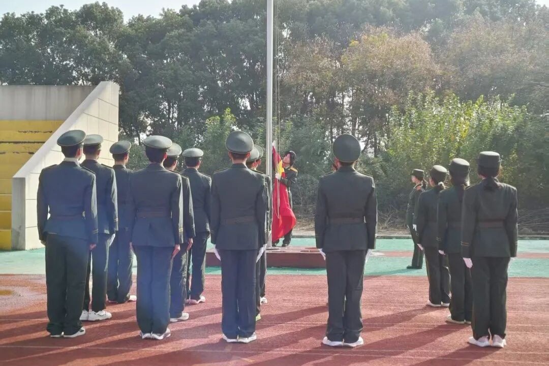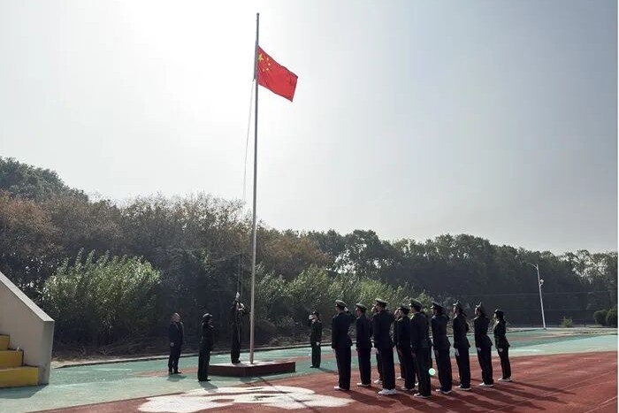 国旗班队员身着整齐制服,步伐铿锵,护送鲜艳的五星红旗步入升旗台。他们目光坚定,动作标准,每一个转身、每一步踏地都彰显着责任与荣光。随着雄壮的《义勇军进行曲》奏响,全场师生肃立注目,五星红旗在阳光中缓缓升起,迎风飘扬于湛蓝天空。