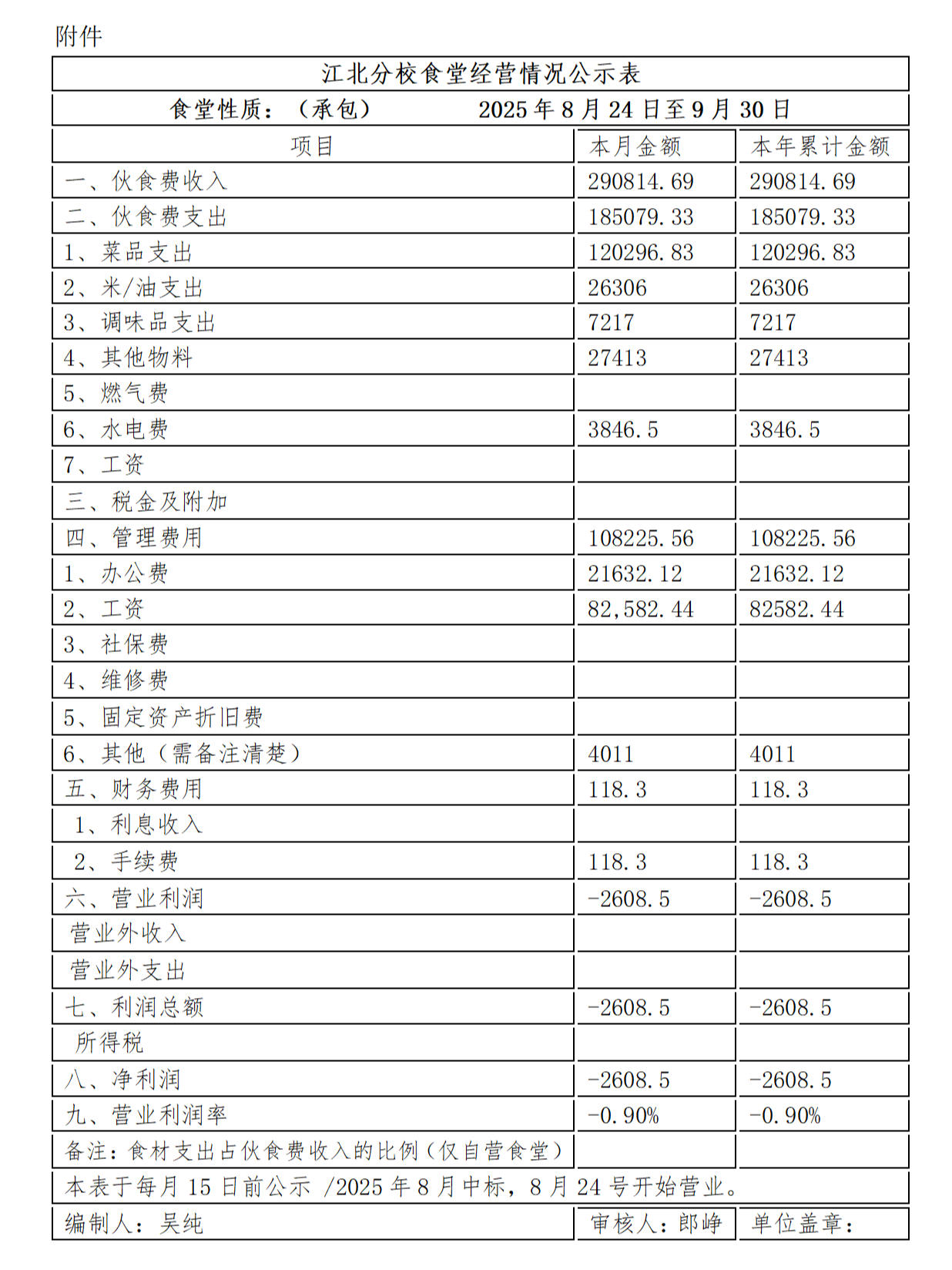 市一中江北分校2025年9月份膳食经费管理公示