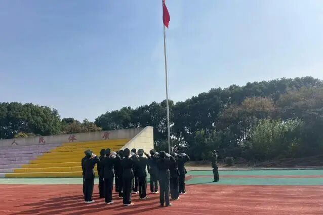 在全体师生的注目礼中,国旗班队员迈着整齐划一、坚定有力的步伐,护卫着鲜艳的五星红旗步入升旗台。伴随着雄壮激昂的国歌声,五星红旗冉冉升起,在湛蓝天空下迎风飘扬。全体师生庄严肃立,浓浓的爱国情怀在每个人心中升腾,为新一周的学习生活注入力量。