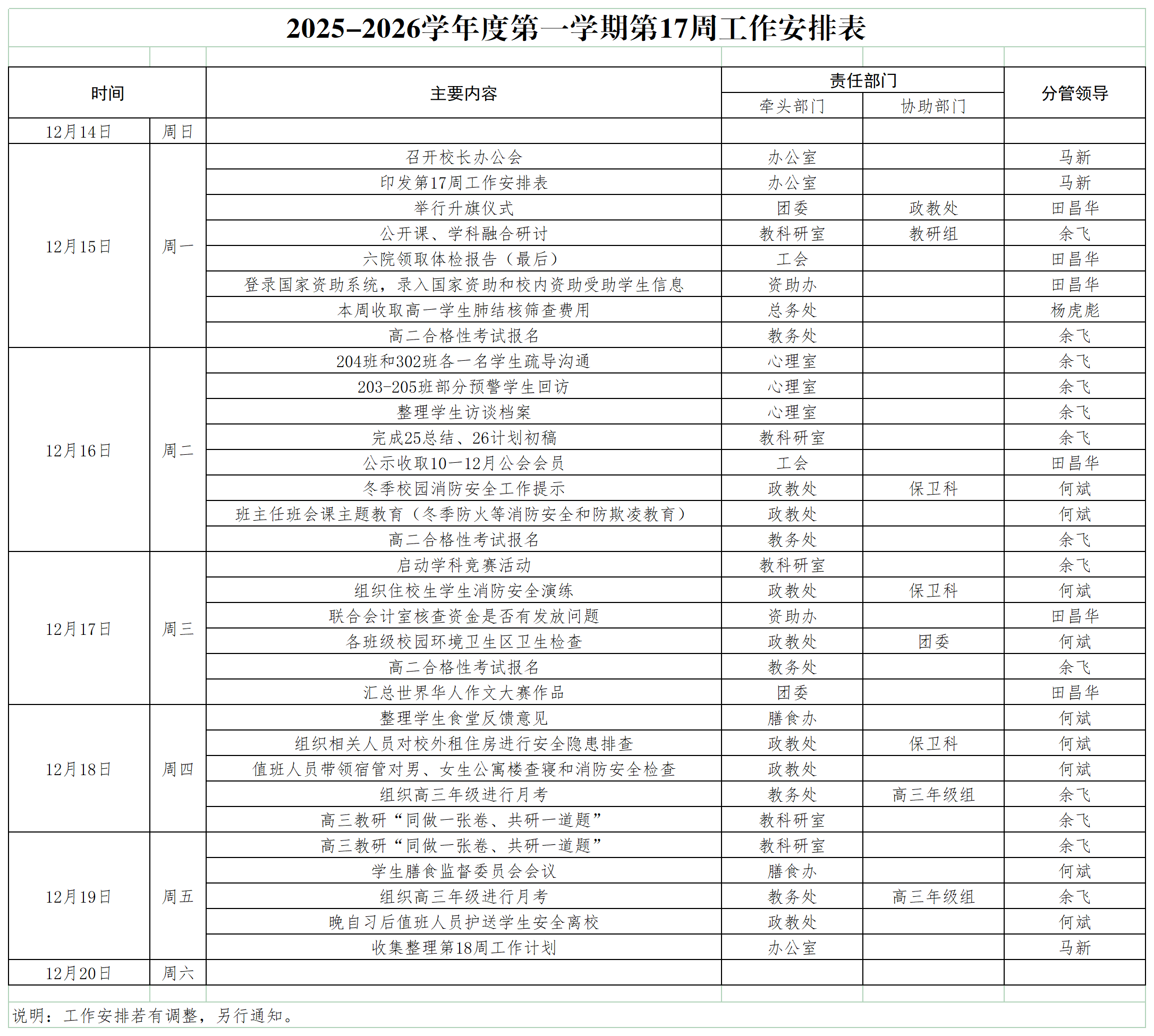 2025-2026学年度第一学期第17周工作安排