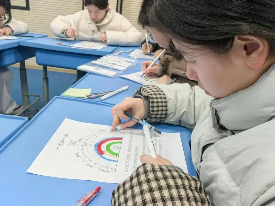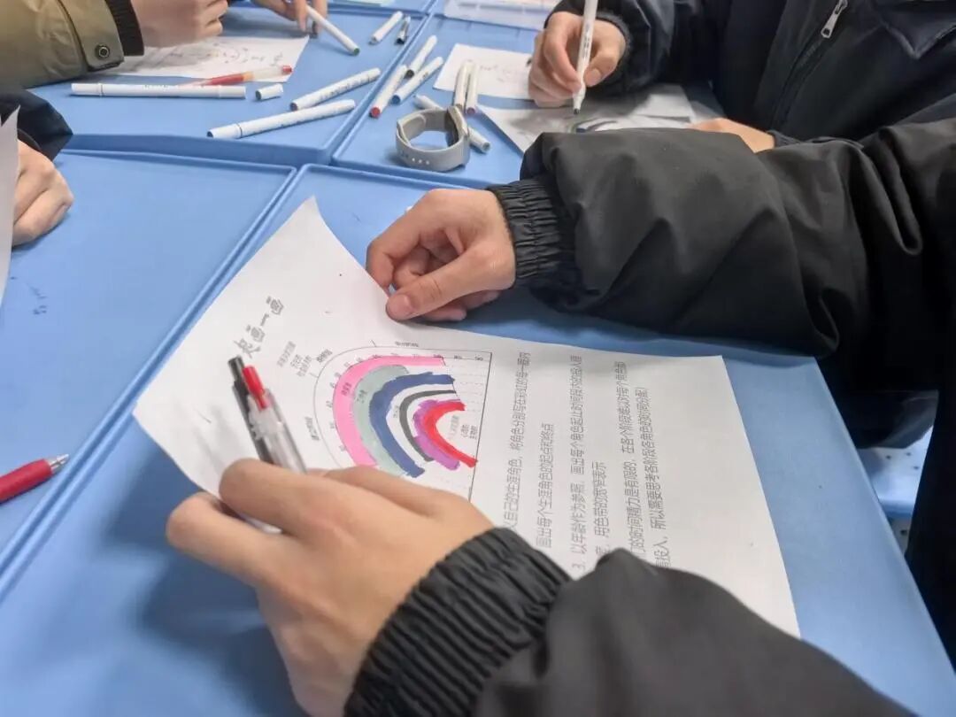 个人创作:将模糊未来转化为可控图像。随后的“绘制未来彩虹图”环节将课堂推向高潮。学生们手持A3模板与彩笔,认真挑选自己未来的核心角色,用色彩深浅与线条宽窄标注不同年龄阶段的精力投入。他们还在图上标注出“高光时刻”“支持资源”,并写下对未来的寄语,将模糊的未来愿景转化为具象的视觉画面。