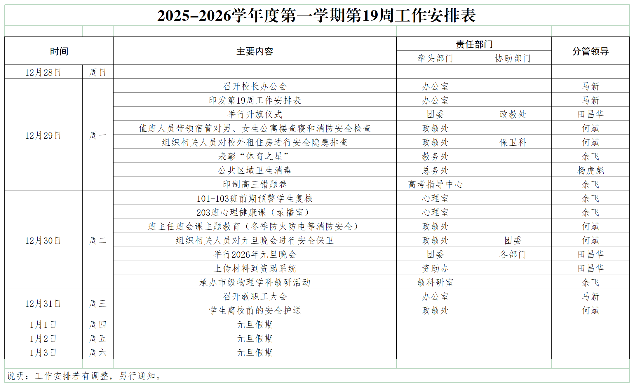 2025-2026学年度第一学期第19周工作安排