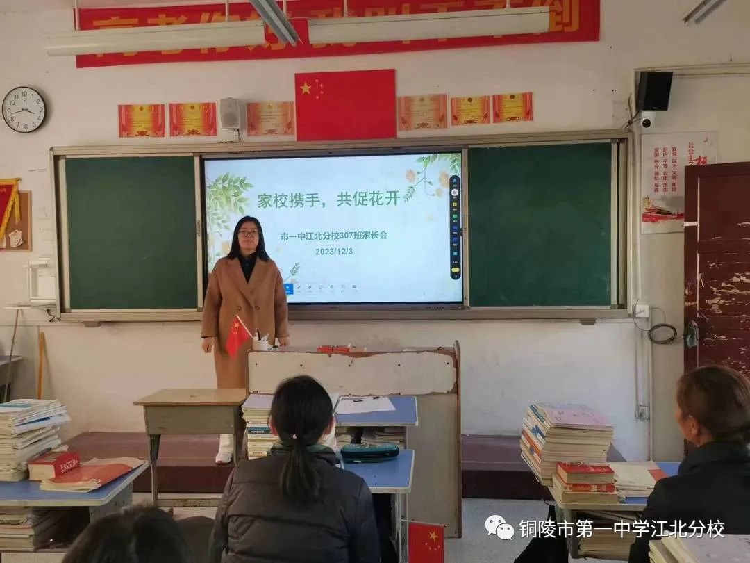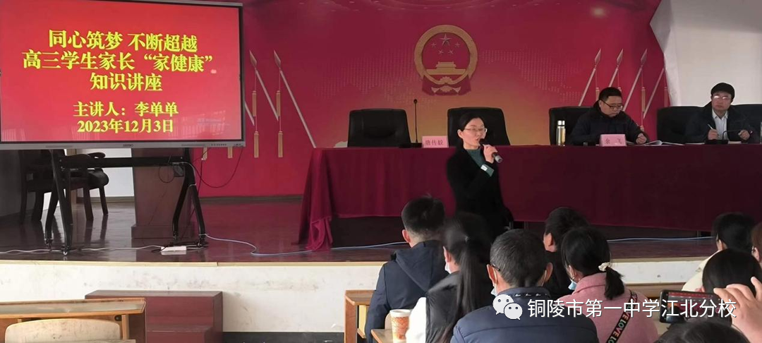 副校长余飞结合铜陵市教体局《关于进一步加强中小学、幼儿园学校家庭社会协同育人机制建设的实施意见》,阐明了家长学校建设的背景情况,并就家校共育工作与家长做了详细交流。他说,学校已经成立了“铜陵市第一中学江北分校家长学校”,意味着搭建了家校密切沟通的桥梁。家庭承担着家庭教育的主题责任,在孩子成长备考的过程中注重家庭、注重家风,构建和谐的家庭关系尤为重要;同时希望家长朋友在日常生活中为子女树立榜样,与子女共同进步;还希望家长朋友积极配合学校教育,共同关注孩子身心健康;家校携手,共育前程。