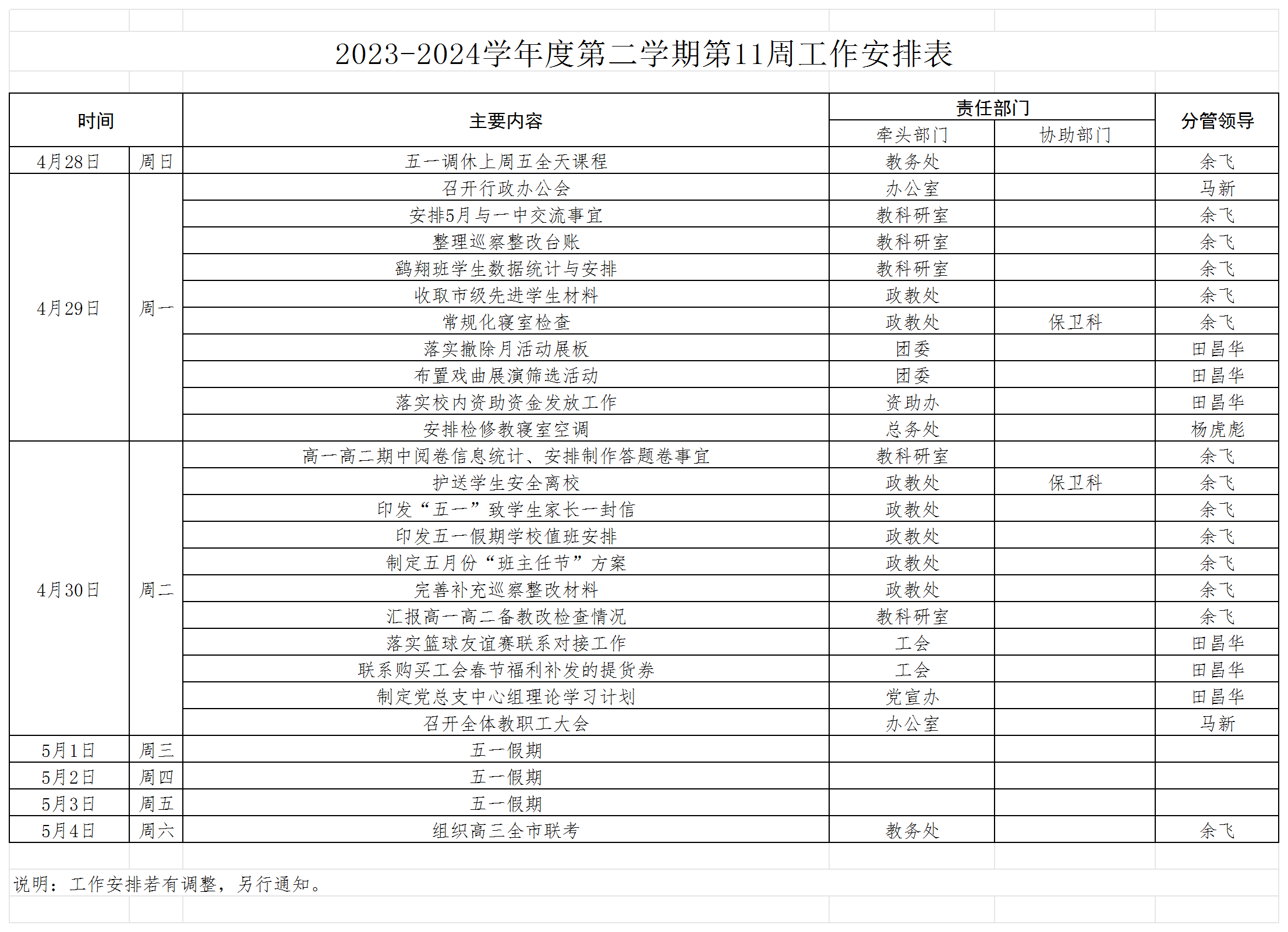 2023-2024学年度第二学期第11周工作安排