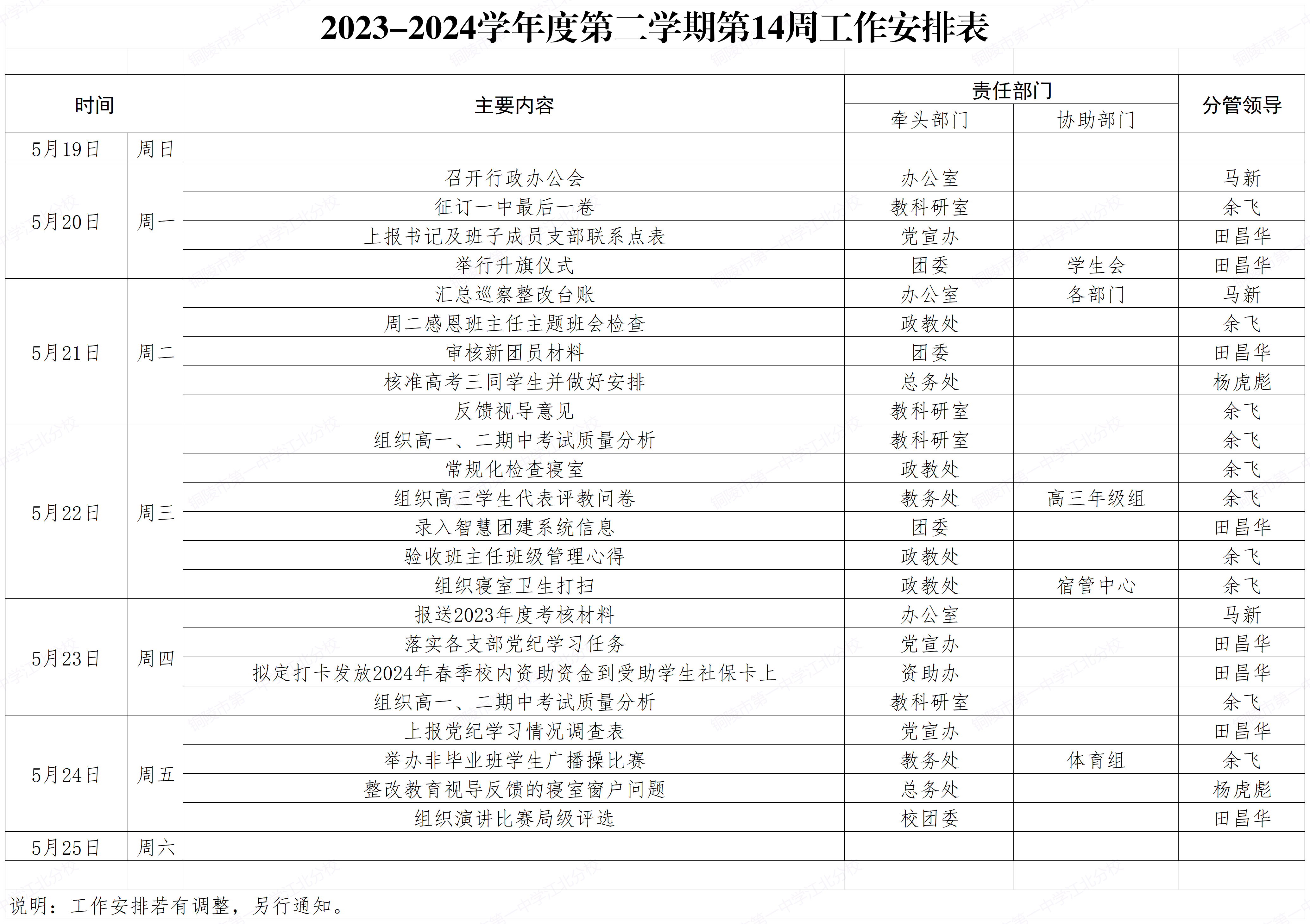 2023-2024学年度第二学期第14周工作安排