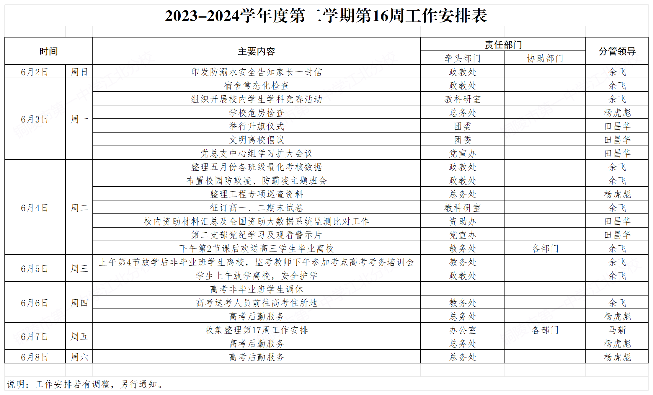 2023-2024学年度第二学期第16周工作安排
